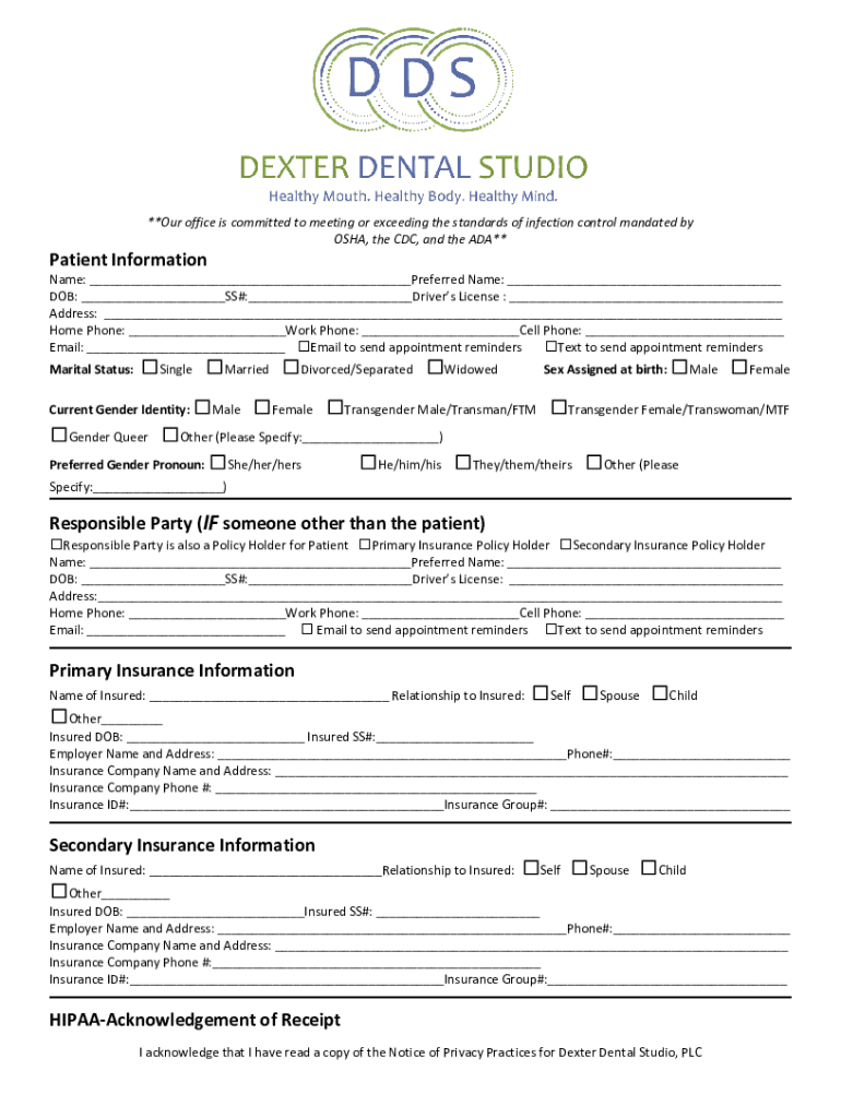 **Our office is committed to meeting or exceeding the standards of infection control mandated by OSHA, the CDC, and the ADA**Patient Information Name: ___Preferred Name: ___ DOB: ___SS#:___Driver's
