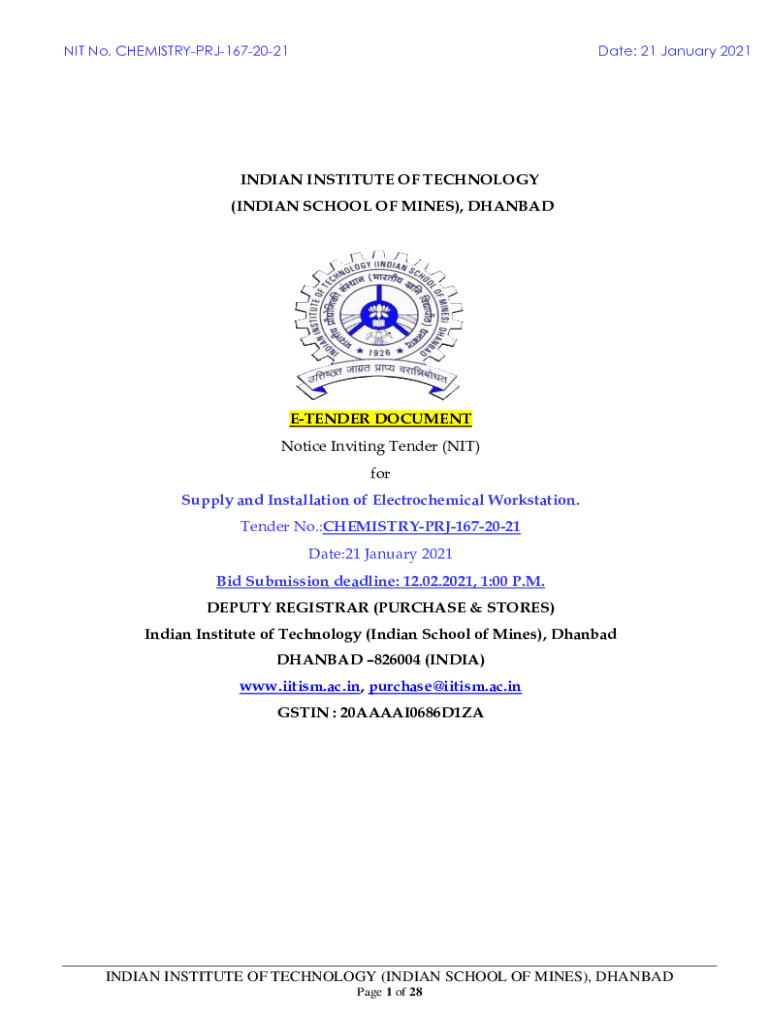 NIT No. CHEMISTRYPRJ1672021Date: 21 January 2021INDIAN INSTITUTE OF TECHNOLOGY (INDIAN SCHOOL OF MINES), DHANBADETENDER DOCUMENT Notice Inviting Tender (NIT) for Supply and Installation of Electrochemical