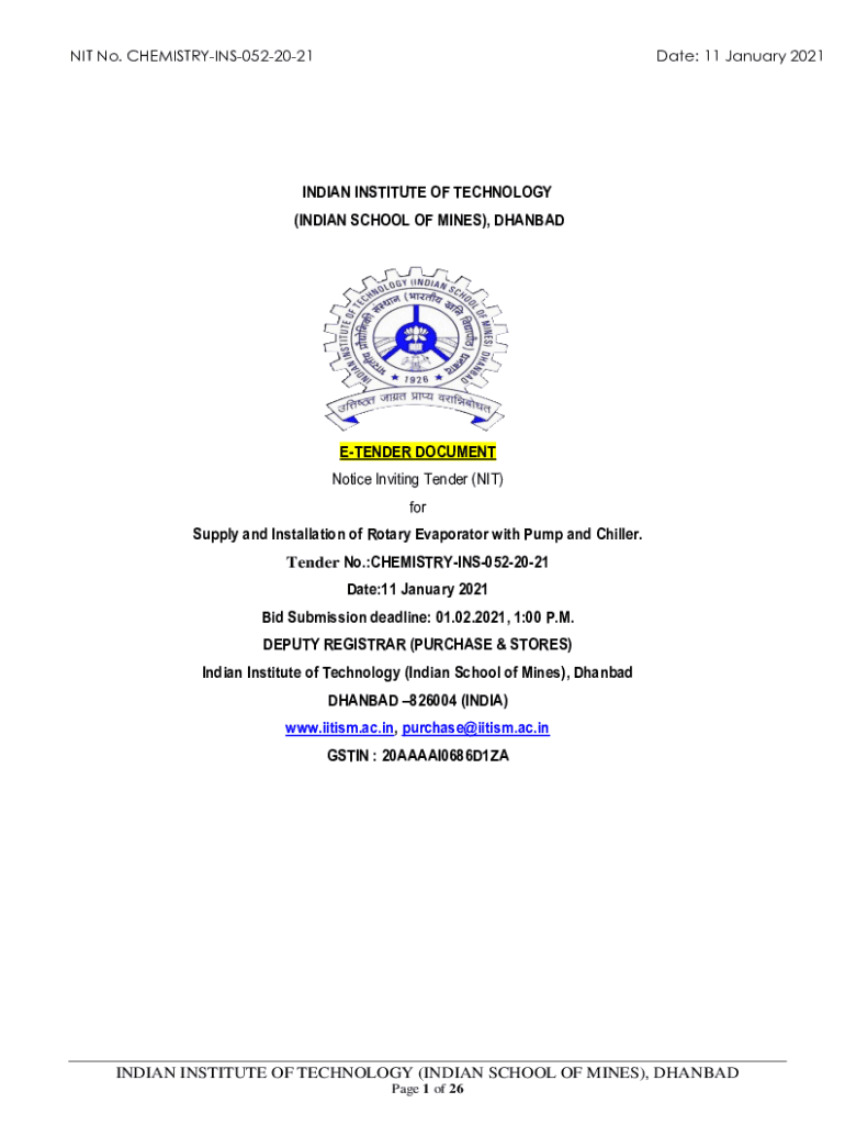 NIT No. CHEMISTRYINS0522021Date: 11 January 2021INDIAN INSTITUTE OF TECHNOLOGY (INDIAN SCHOOL OF MINES), DHANBADETENDER DOCUMENT Notice Inviting Tender (NIT) for Supply and Installation of Rotary