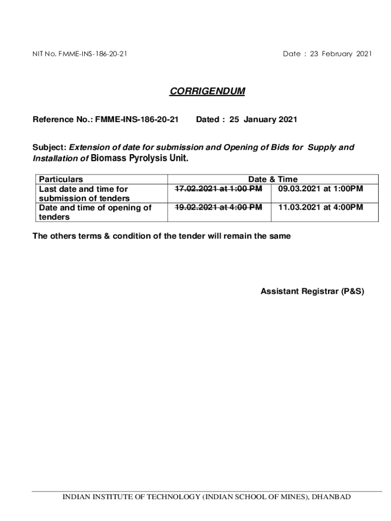 NIT No. FMMEINS1862021Date : 23 February 2021CORRIGENDUM Reference No.: FMMEINS1862021Dated : 25 January 2021Subject: Extension of date for submission and Opening of Bids for Supply and Installation