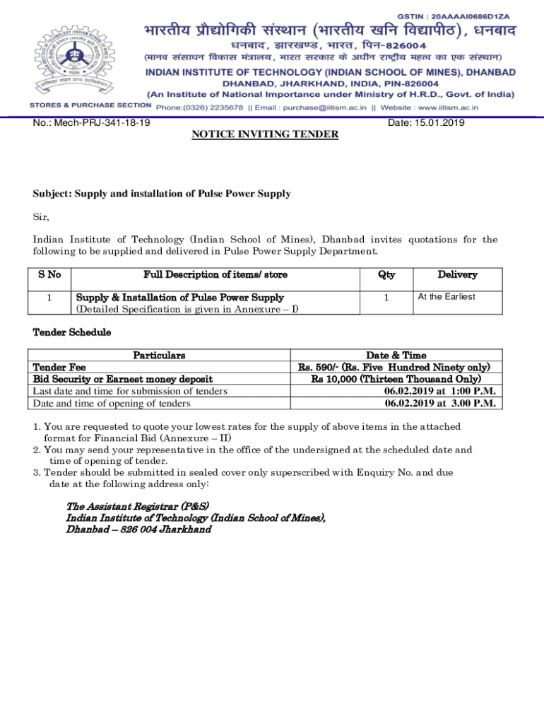 No.: MechPRJ3411819Date: 15.01.2019NOTICE INVITING TENDERSubject: Supply and installation of Pulse Power Supply