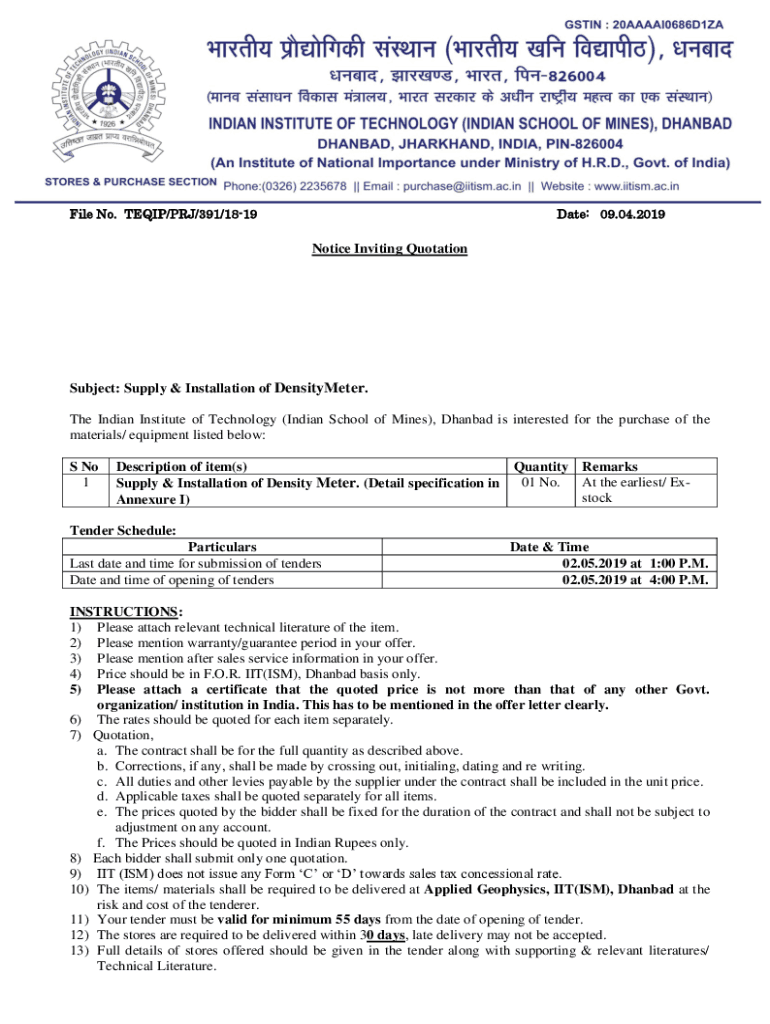 File No. TEQ IP/PRO/391/1819Date: 09.04.2019Notice Inviting QuotationSubject: Supply & Installation of Tensiometer. The Indian Institute of Technology (Indian School of Mines), Dhanbad is interested