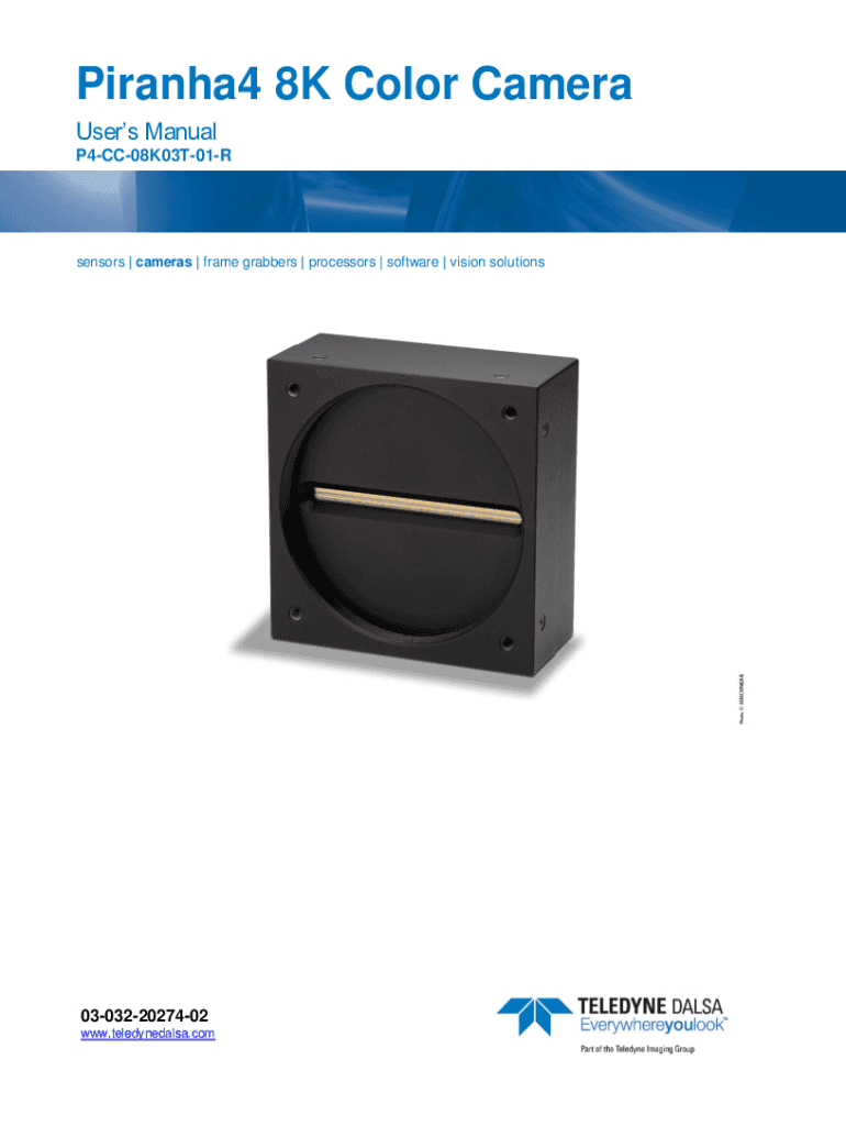 Piranha4 8K Color Camera Users Manual P4CC08K03T01Rsensors | cameras | frame grabbers | processors | software | vision solutions030322027402 www.teledynedalsa.com 2019 Teletype Digital Imaging, Inc.