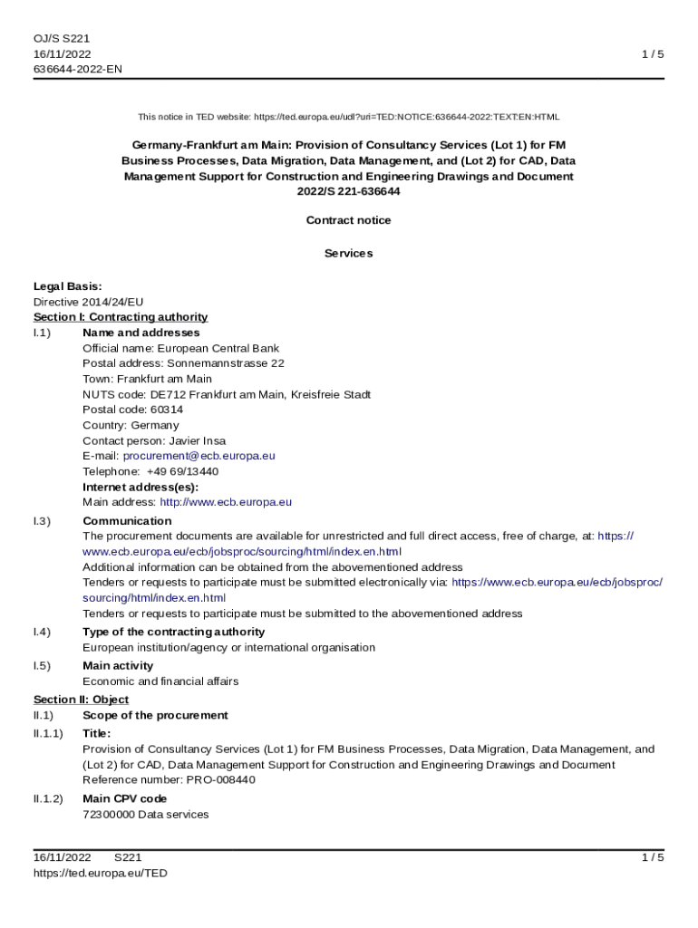 OJ/S S221 16/11/2022 6366442022EN1/5This notice in TED website: https://ted.europa.eu/udl?uriTED:NOTICE:6366442022:TEXT:EN:HTMLGermanyFrankfurt am Main: Provision of Consultancy Services (Lot 1) for