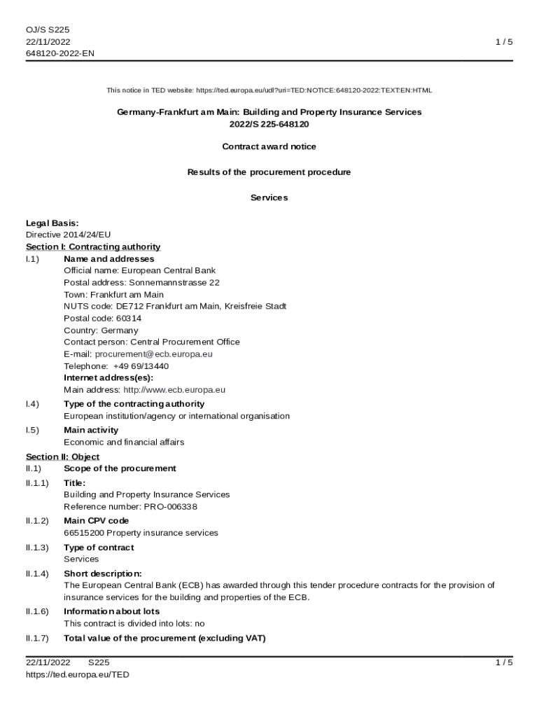 OJ/S S225 22/11/2022 6481202022EN1/5This notice in TED website: https://ted.europa.eu/udl?uriTED:NOTICE:6481202022:TEXT:EN:HTMLGermanyFrankfurt am Main: Building and Property Insurance Services 2022/S