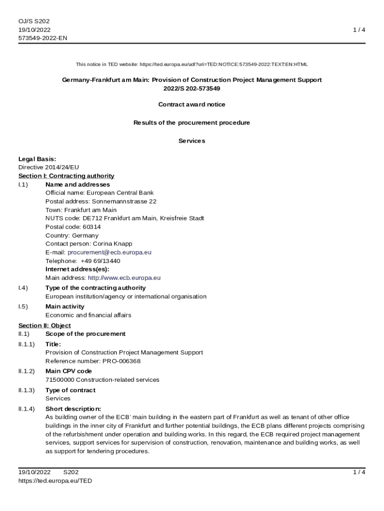 OJ/S S202 19/10/2022 5735492022EN1/4This notice in TED website: https://ted.europa.eu/udl?uriTED:NOTICE:5735492022:TEXT:EN:HTMLGermanyFrankfurt am Main: Provision of Construction Project Management