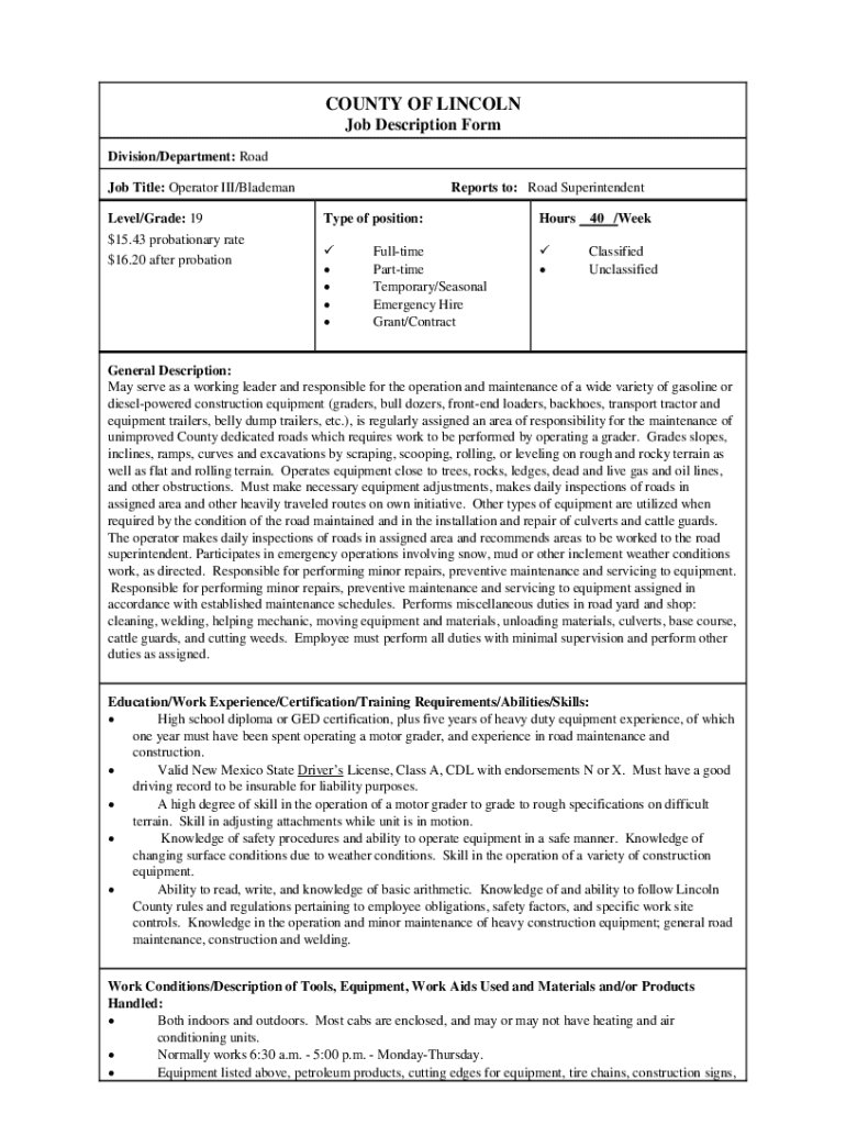 COUNTY OF LINCOLN Job Description Form Division/Department: Road Job Title: Operator III/Blade man Level/Grade: $1915.43 probationary rate $16.20 after probationReports to: Road Superintendent Type