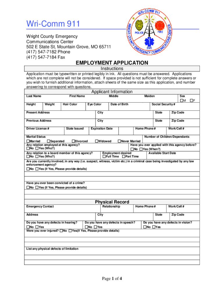 Rico 911 Wright County Emergency Communications Center 502 E State St, Mountain Grove, MO 65711 (417) 5477182 Phone (417) 5477184 Employment APPLICATION Instructions Application must be typewritten