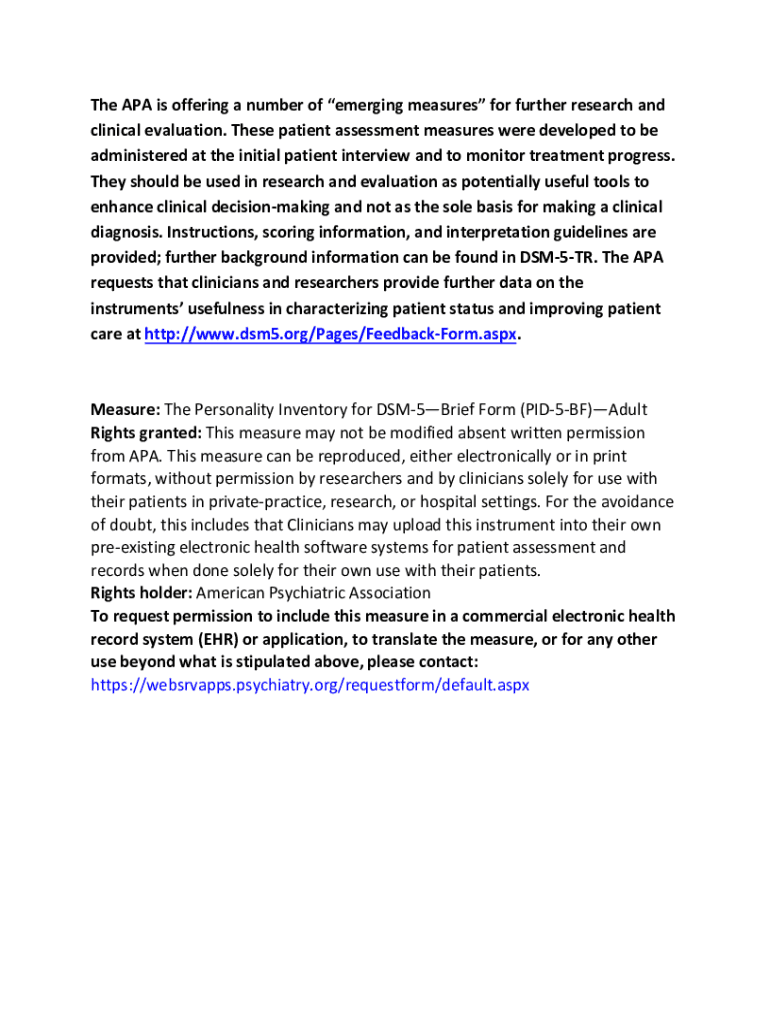 The APA is offering a number of emerging measures for further research and clinical evaluation. These patient assessment measures were developed to be administered at the initial patient interview