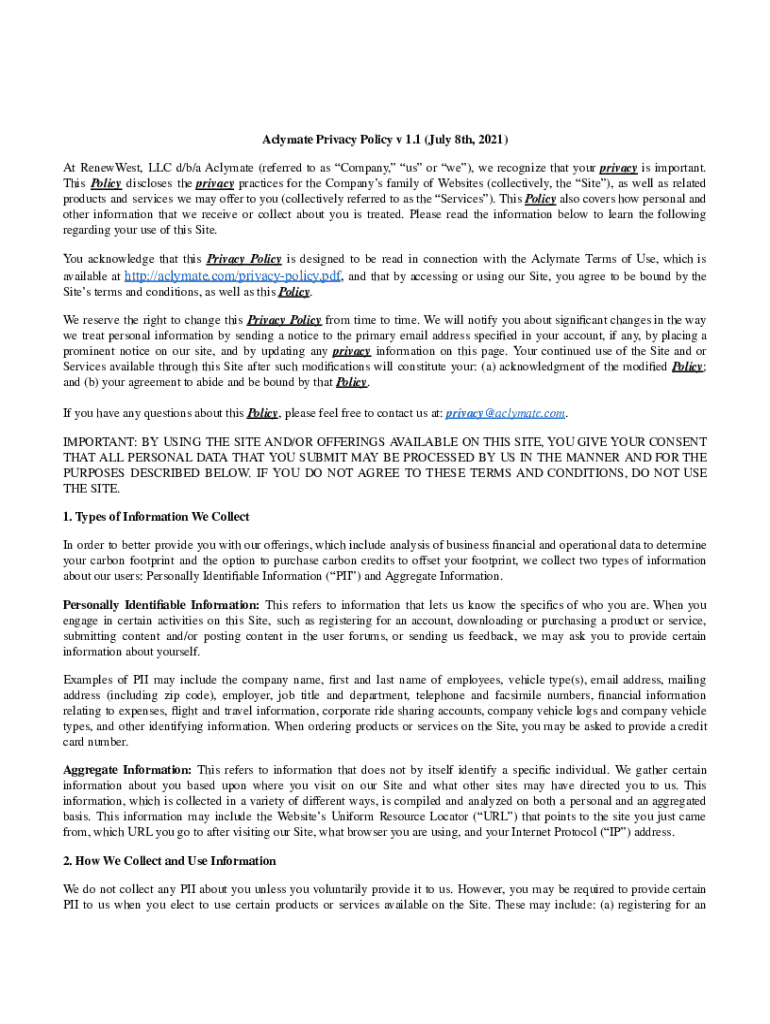 aclymatecompdfprivacy-policyht t p a must include details about the types of personal information collected, how it is used, shared, and stored.