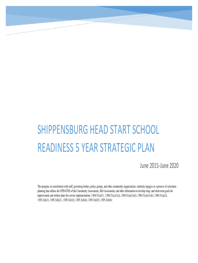 SchSHIPPENSBURG HEAD START SCHOOL READINESS 5-YEAR STRATEGIC PLAN June 2015June 2020 The program, in consultation with staff, governing bodies, policy groups, and other community organizations, routinely
