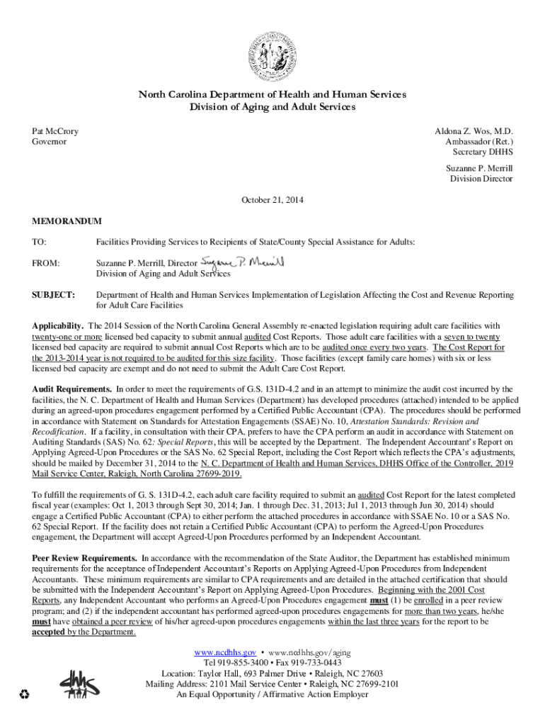 North Carolina Department of Health and Human Services Division of Aging and Adult Services Pat McCrory GovernorAldona Z. Was, M.D. Ambassador (RET.) Secretary HHS Suzanne P. Merrill Division Director