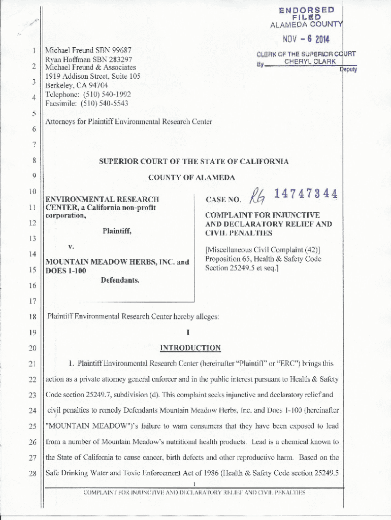1et seq.) also known as Proposition 65, businesses with ten or more employees must provide a2clear and reasonable warning prior to exposing persons to these chemicals.3II4PARTIES52. Plaintiff ERC