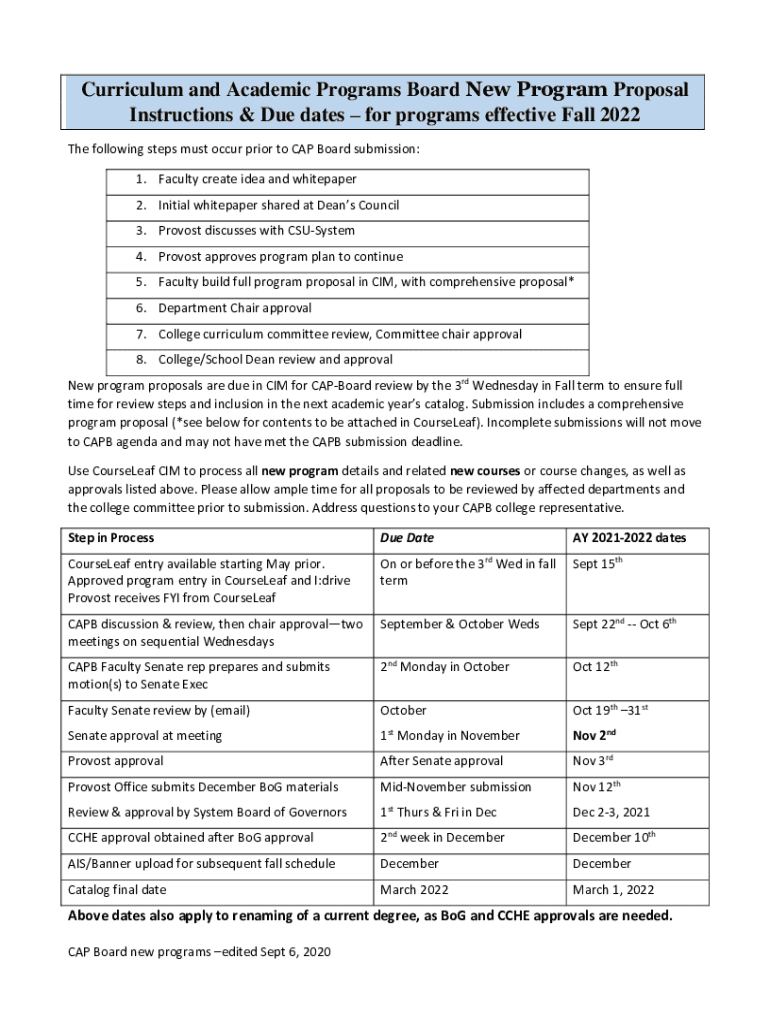 Curriculum and Academic Programs Board New Program Proposal Instructions & Due dates for programs effective Fall 2022 The following steps must occur prior to CAP Board submission: 1. Faculty create