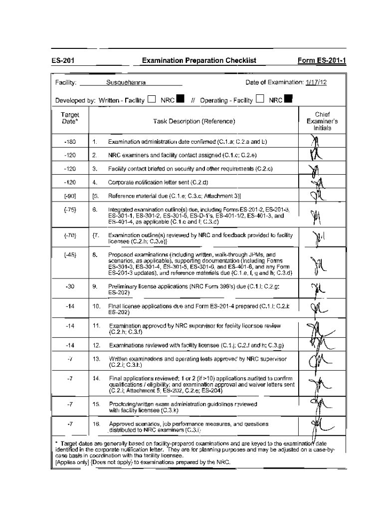 Form ES2011Examination Preparation ChecklistES201Facility:Date of Examination: 1/17/12SusguehannaDeveloped by:Written Facility Target Date×NRC./1 Operating FacilityDNRC. Chief Examiner\'s InitialsTask