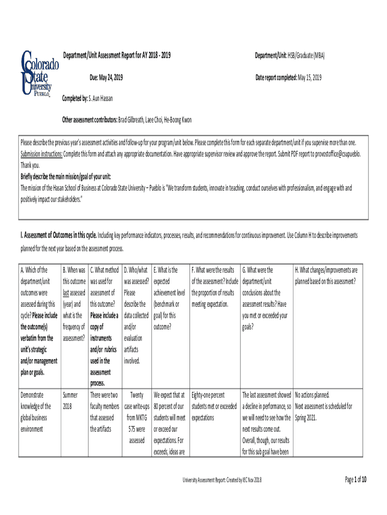 Department/Unit Assessment Report for A 2018 2019Department/Unit: HUB/Graduate (MBA)Due: May 24, 2019Date report completed: May 15, 2019Completed by: S. AUN Hassan Other assessment contributors: Brad