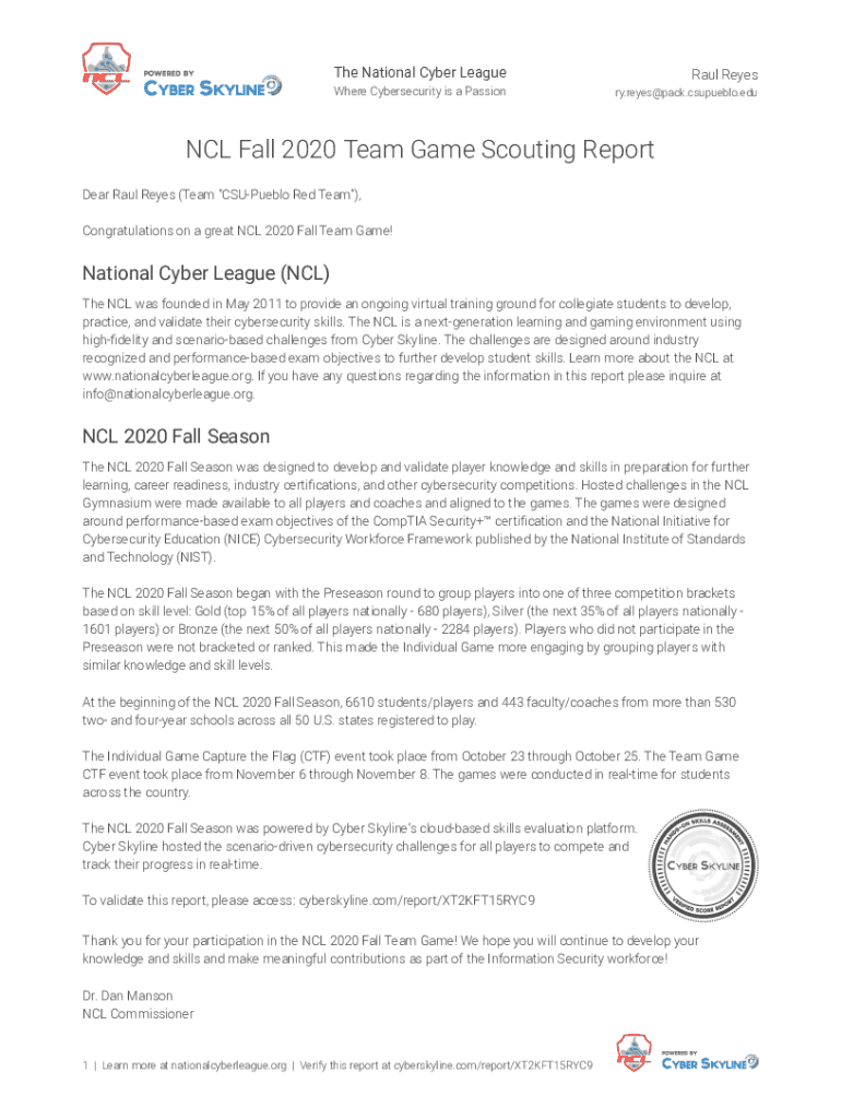 The National Cyber League Raul Elsewhere Cybersecurity is a Passionry.reyes@pack.csupueblo.eduNCL Fall 2020 Team Game Scouting Report Dear Raul Reyes (Team \” CSU Pueblo Red Team\”), Congratulations