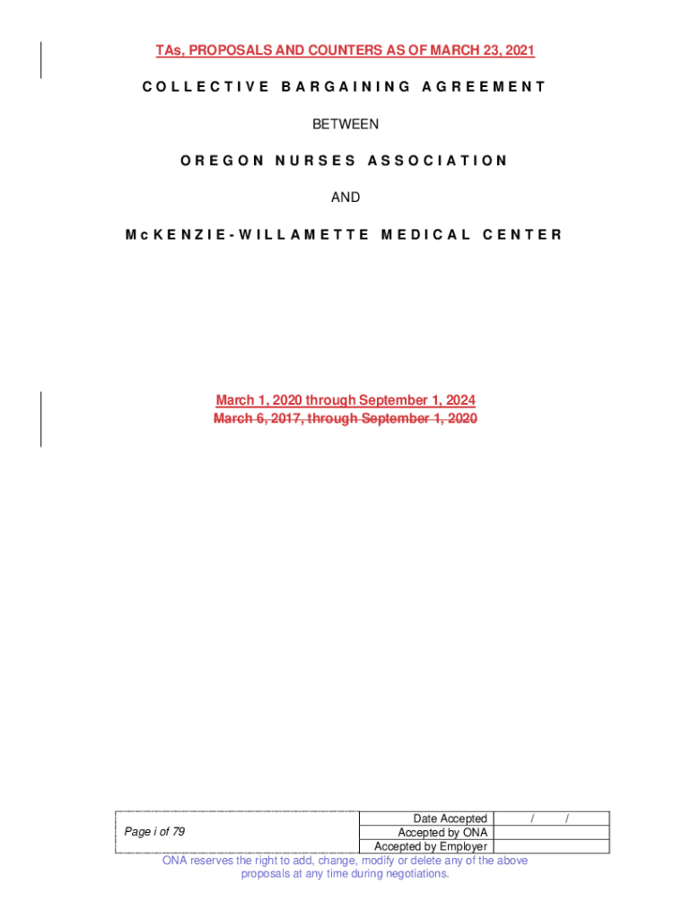 TAS, PROPOSALS AND COUNTERS AS OF MARCH 23, 2021, COLLECTIVE BARGAINING AGREEMENT BETWEEN OREGON NURSES ASSOCIATION AND McKENZIEWILLAMETTE MEDICAL CENTER March 1, 2020, through September 1, 2024 March