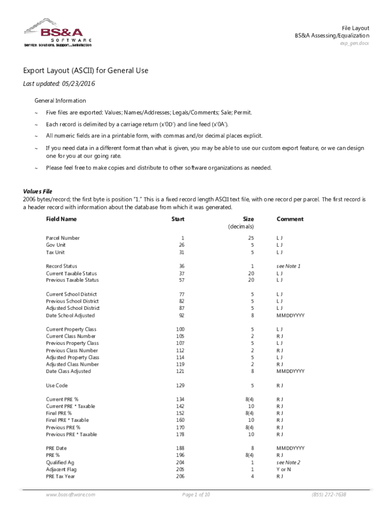File Layout BSA Assessing/Equalization exp_gen.docxExport Layout (ASCII) for General Use Last updated: 05/23/2016 General Information Five files are exported: Values; Names/Addresses; Legals/Comments;