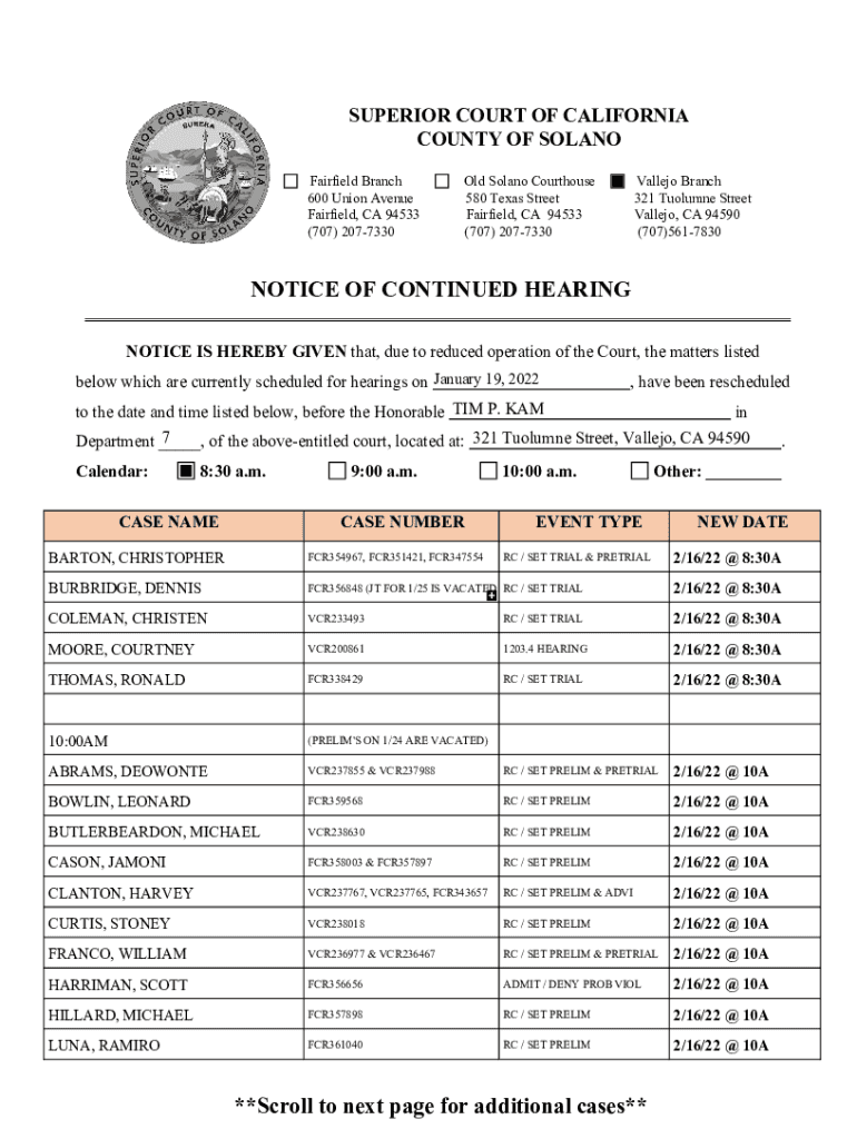 Get the free solano.courts.ca.gov CRDEPT012022/02/09NOTICE OF CONTINUED HEARING - Solano County S...