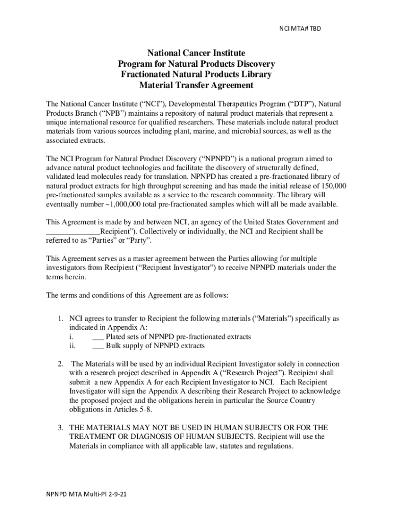 NCI MTA# Binational Cancer Institute Program for Natural Products Discovery Fractionized Natural Products Library Material Transfer Agreement The National Cancer Institute (NCI), Developmental Therapeutics