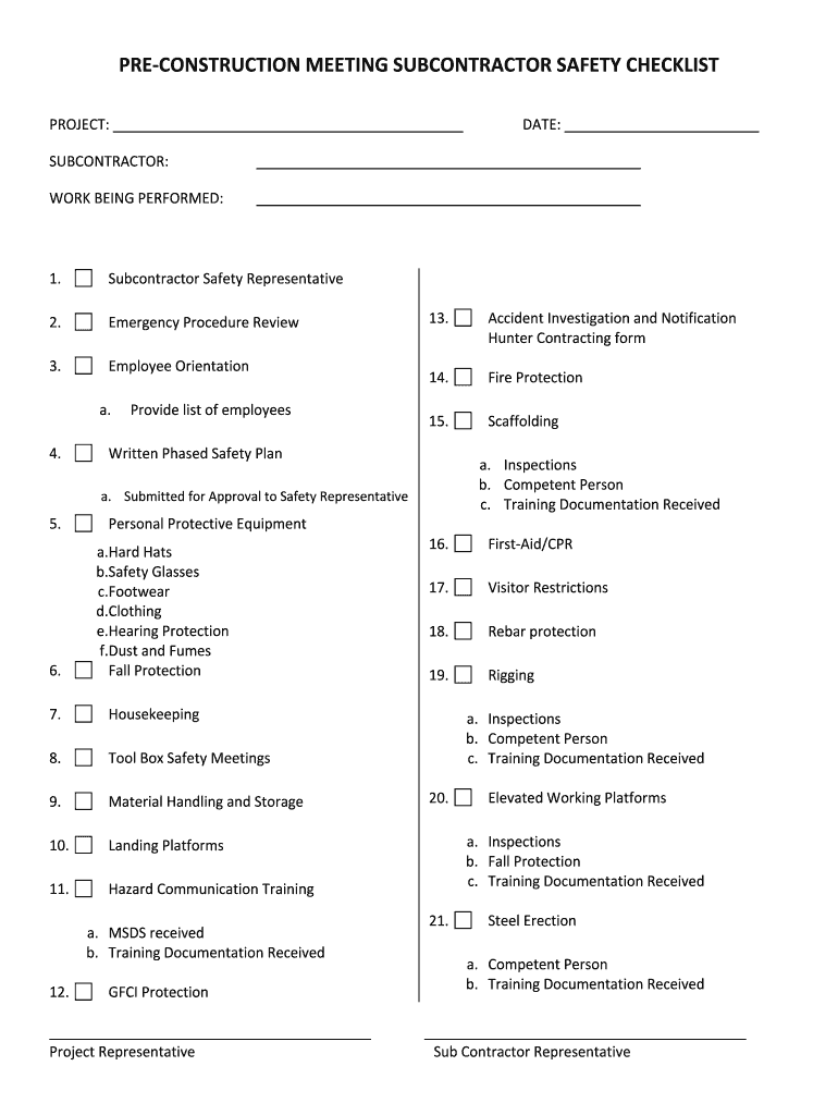 Get the free Pre-construction meeting subcontractor safety checklist - Hunter ...