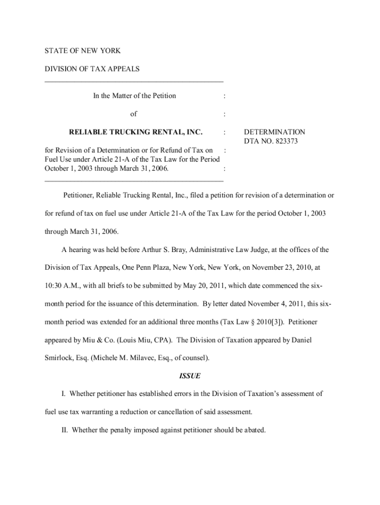 STATE OF NEW YORK DIVISION OF TAX APPEALS ___ In the Matter of the Petition:of:RELIABLE TRUCKING RENTAL, INC.:DETERMINATION DTA NO. 823373for Revision of a Determination or for Refund of Tax on :