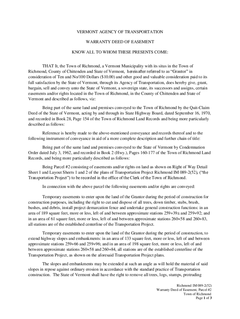 VERMONT AGENCY OF TRANSPORTATION WARRANTY DEED OF EASEMENT KNOW ALL TO WHOM THESE PRESENTS COME: THAT It, the Town of Richmond, a Vermont Municipality with its sites in the Town of Richmond, County