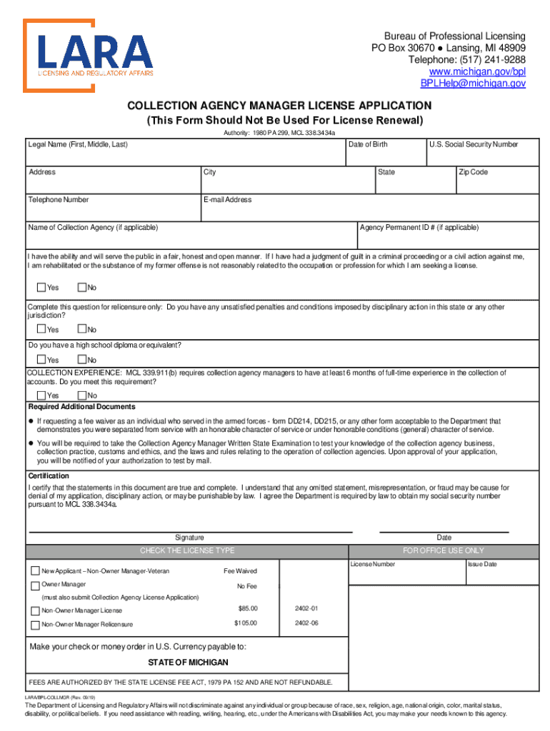 Bureau of Professional Licensing PO Box 30670 Lansing, MI 48909 Telephone: (517) 2419288 www.michigan.gov/bpl BPLHelp@michigan.govCOLLECTION AGENCY MANAGER LICENSE APPLICATION (This Form Should Not