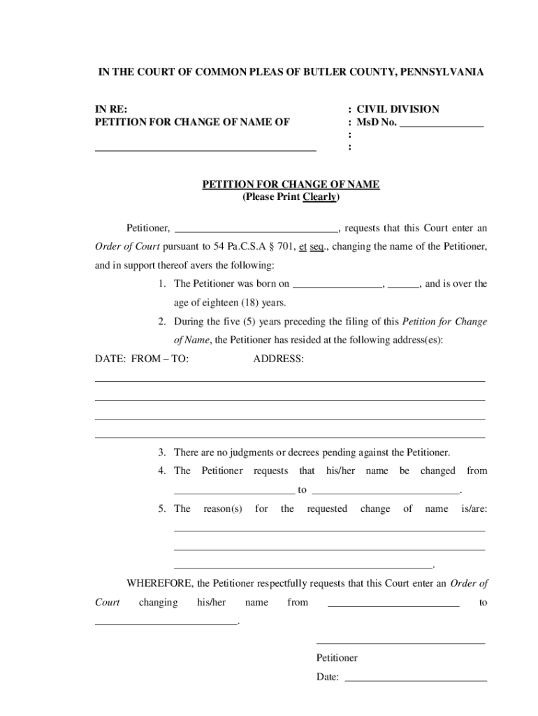 IN THE COURT OF COMMON PLEAS OF BUTLER COUNTY, PENNSYLVANIAN RE: PETITION FOR CHANGE OF NAME OF: CIVIL DIVISION : MSD No. ___ : :___PETITION FOR CHANGE OF NAME (Please Print Clearly) Petitioner, ___,