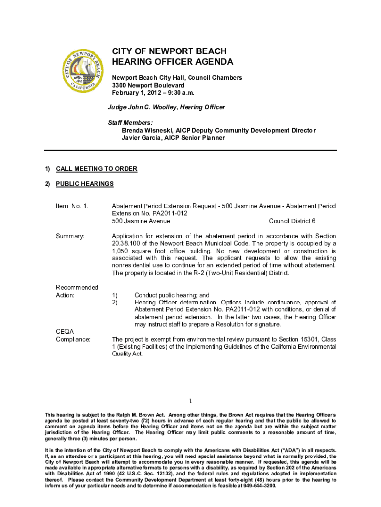 CITY OF NEWPORT BEACH HEARING OFFICER AGENDA Newport Beach City Hall, Council Chambers 3300 Newport Boulevard February 1, 2012 9:30 a.m. Judge John C. Woolly, Hearing Officer Staff Members: Brenda
