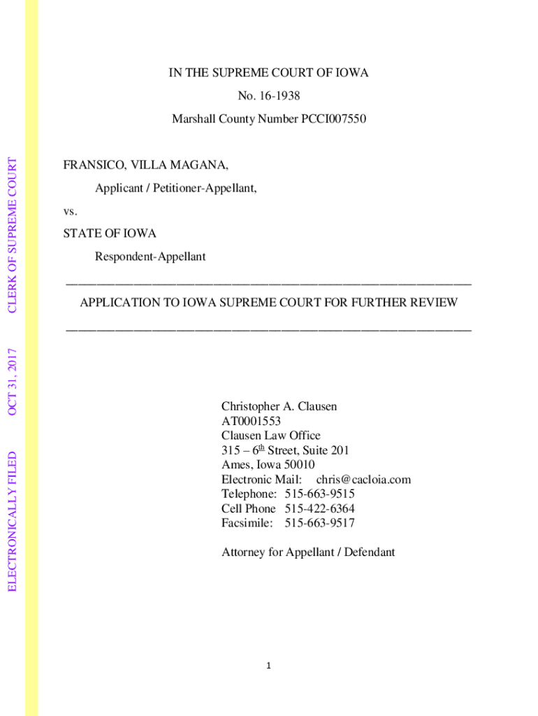 No. 161938CLERK OF SUPREME COURT Marshall County Number PCCI007550FRANSICO, VILLA MAGAÑA,