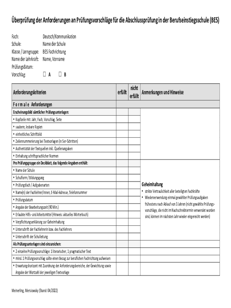 Berrying her Anforderungen a Prfungsvorschlge for die Abschlussprfung in her Berufseinstiegsschule (BES)