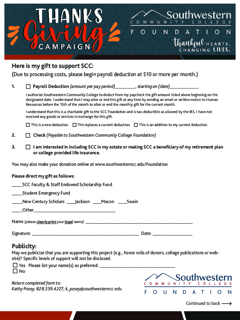 Here is my gift to support SCC: (Due to processing costs, please begin payroll deduction at $10 or more per month.) 1. Payroll Deduction (amount per pay period)___, starting on (date)___I authorize