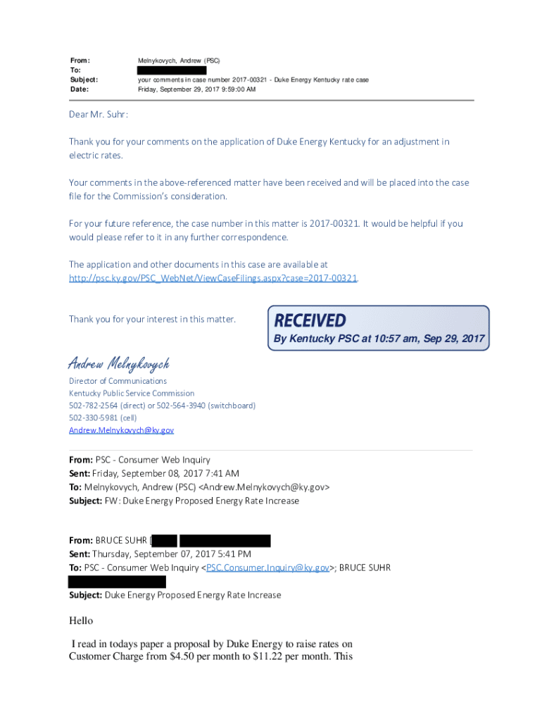 From: To: Subject: Date:Melnykovych, Andrew (PSC) your comments in case number 201700321 Duke Energy Kentucky rate case Friday, September 29, 2017 9:59:00 Ampere Mr. Ruhr: Thank you for your comments