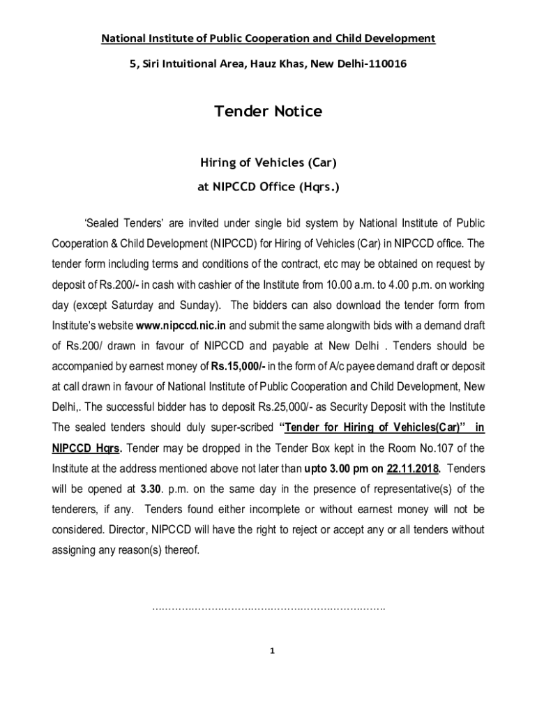 National Institute of Public Cooperation and Child Development 5, Siri Intentional Area, Haul Has, New Delhi110016Tender Notice Hiring of Vehicles (Car) at NIP CCD Office (Hers.) Sealed Tenders are