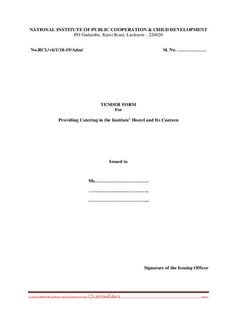 SL. No. No.RCL/vii/1/1819/Adm/TENDER FORM