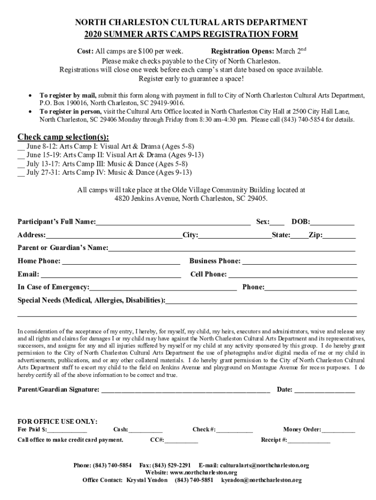 NORTH CHARLESTON CULTURAL ARTS DEPARTMENT 2020 SUMMER ARTS CAMPS REGISTRATION FORM Cost: All camps are $100 per week. Registration Opens: March 2nd Please make checks payable to the City of North