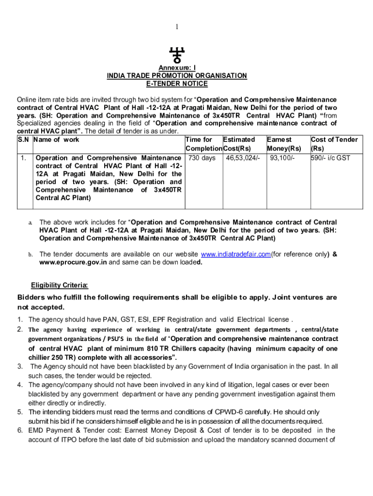 1Annexure: I INDIA TRADE PROMOTION Organization TENDER NOTICE Online item rate bids are invited through two bid system for Operation and Comprehensive Maintenance contract of Central HVAC Plant of