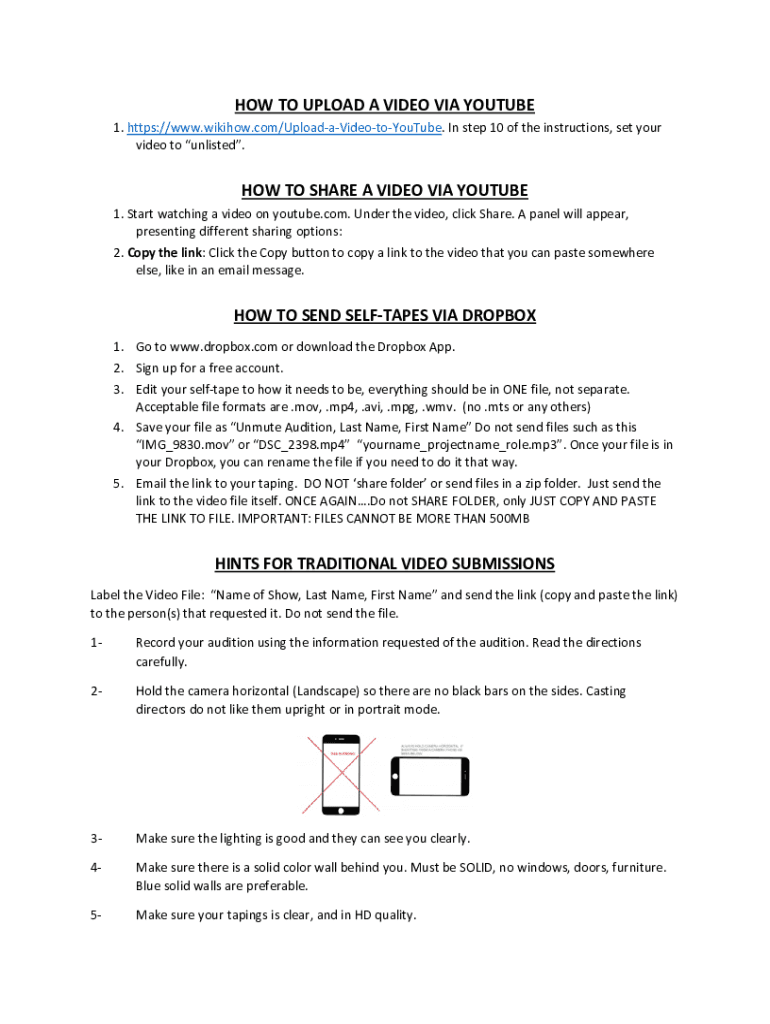 HOW TO UPLOAD A VIDEO VIA YouTube 1. https://www.wikihow.com/UploadaVideotoYouTube. In step 10 of the instructions, set your video to unlisted. HOW TO SHARE A VIDEO VIA YouTube 1. Start watching a