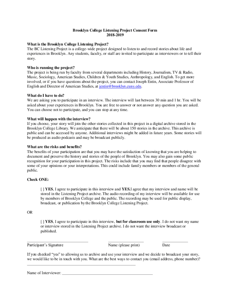 Get the free Brooklyn College Listening Project Consent Form 2018-2019
