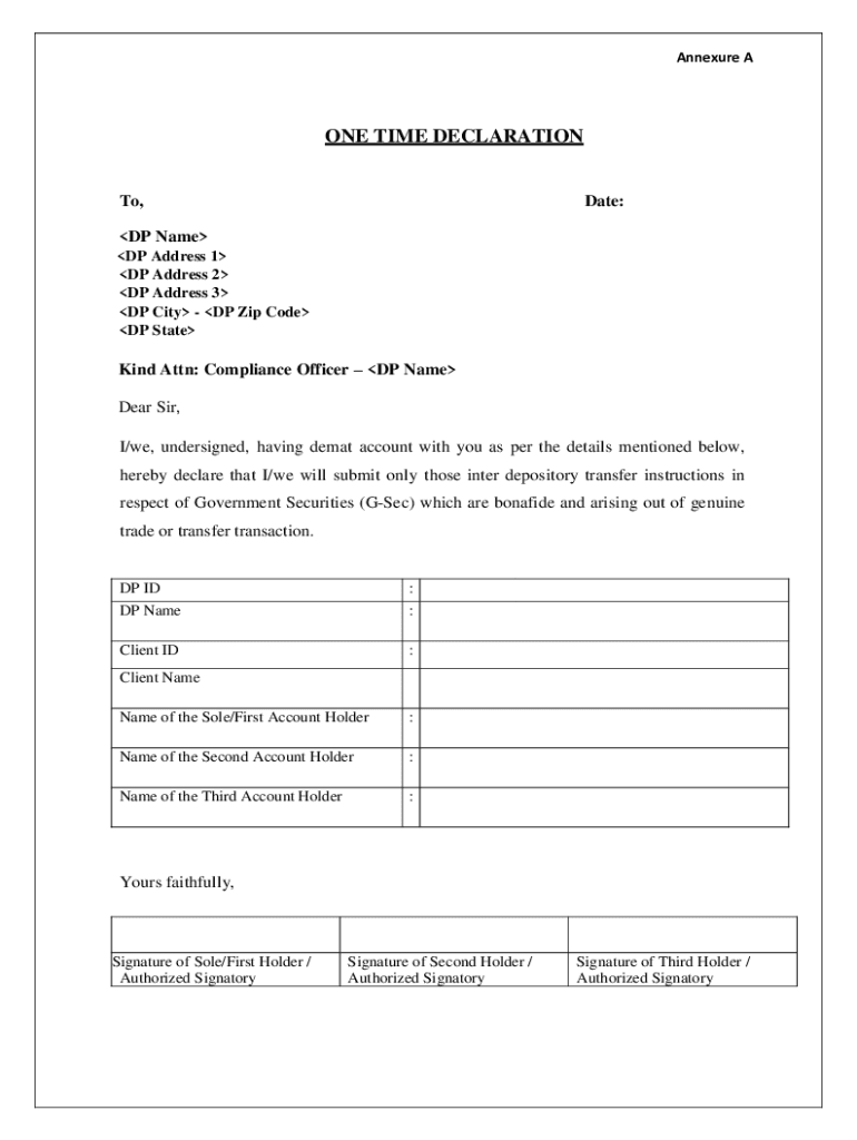Appendix ONE TIME Declaration, Date:DP Name DP Address 1 DP Address 2 DP Address 3 DP City DP Zip Code DP Stated Attn: Compliance Officer DP Name Dear Sir, I/we, undersigned, having deceit account