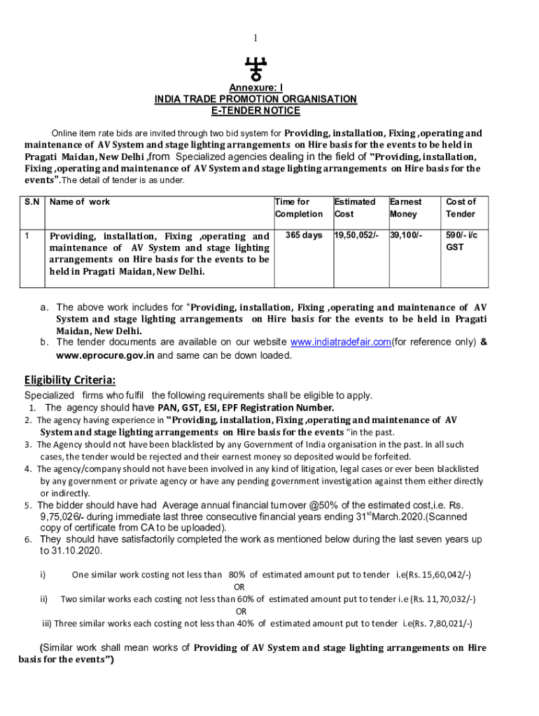 1Annexure: I INDIA TRADE PROMOTION Organization TENDER NOTICE Online item rate bids are invited through two bid system for Providing, installation, Fixing, operating and maintenance of AV System and