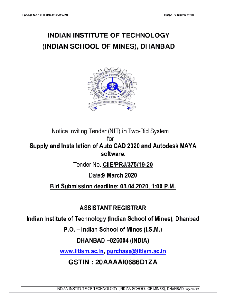 Tender No.: CITE/PRO/375/1920Dated: 9 March 2020INDIAN INSTITUTE OF TECHNOLOGY (INDIAN SCHOOL OF MINES), DHANBADNotice Inviting Tender (NIT) in Turbid System for Supply and Installation of Auto CAD
