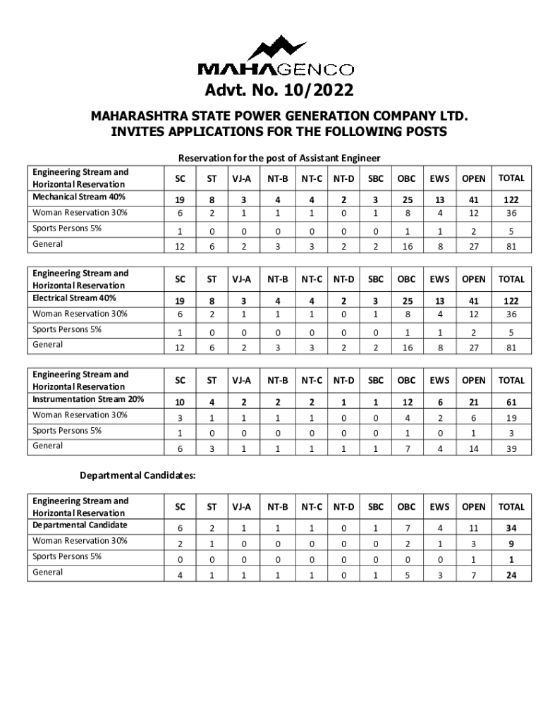 Advt. No. 10/2022 MAHARASHTRA STATE POWER GENERATION COMPANY LTD. INVITES APPLICATIONS FOR THE FOLLOWING POSTS Reservation for the post of Assistant Engineer Engineering Stream and Horizontal Reservation