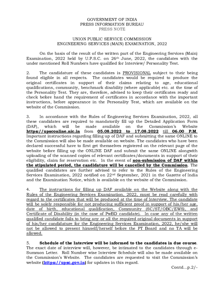 GOVERNMENT OF INDIA PRESS INFORMATION BUREAU PRESS NOTE UNION PUBLIC SERVICE COMMISSION ENGINEERING SERVICES (MAIN) EXAMINATION, 2022 On the basis of the result of the written part of the Engineering