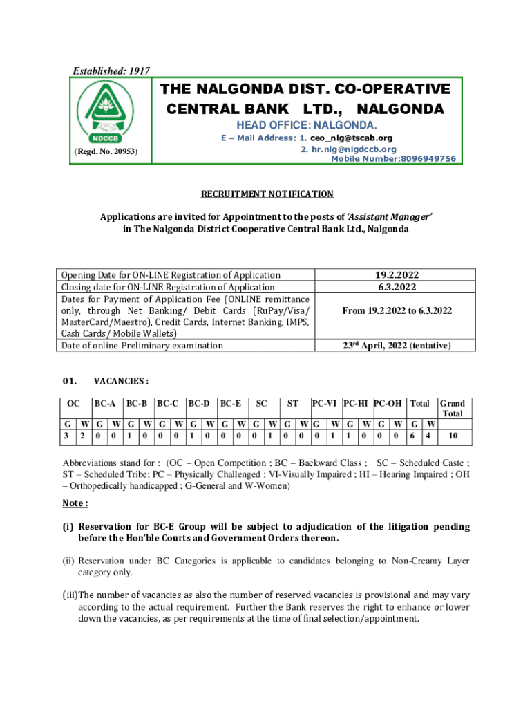 Established: 1917THE AGENDA DIST. COOPERATIVE CENTRAL BANK LTD., AGENDA HEAD OFFICE: AGENDA. E Mail Address: 1. ceo_nlg@tscab.org 2. hr.nlg@nlgdccb.org Mobile Number:8096949756(Red. No. 20953)RECRUITMENT