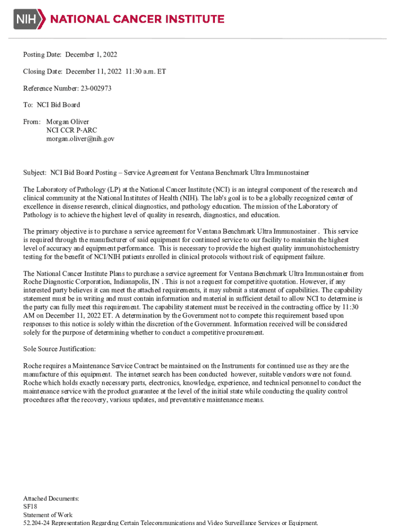 Posting Date: December 1, 2022, Closing Date: December 11, 2022 11:30 a.m. ET Reference Number: 23002973 To: NCI Bid Board From: Morgan Oliver NCI CCR PARC morgan.oliver@nih.govSubject: NCI Bid Board
