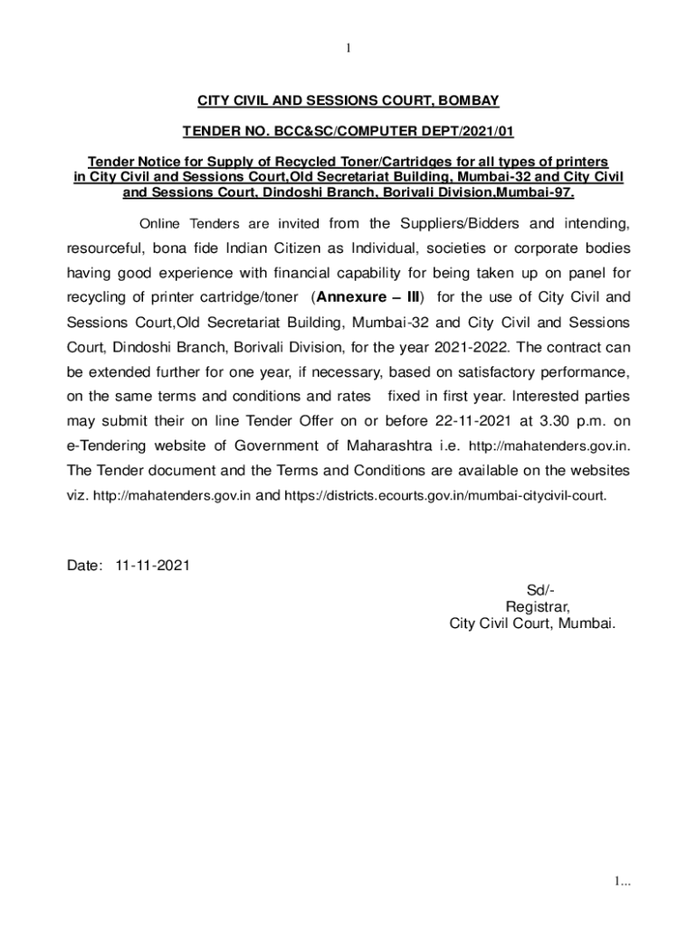 1CITY CIVIL AND SESSIONS COURT, BOMBAY TENDER NO. ACCESS/COMPUTER DEPT/2021/01 Tender Notice for Supply of Recycled Toner/Cartridges for all types of printers in City Civil and Sessions Court, Old
