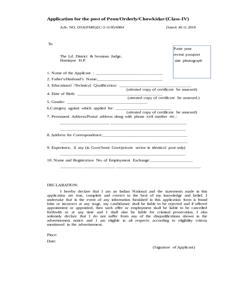 Get the free Application for the post of Peon/Orderly/Chowkidar/(Class-IV)